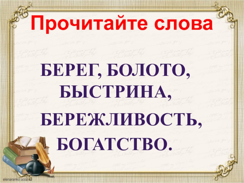 Прочитайте словаБерег, болото, быстрина,Бережливость, Богатство.