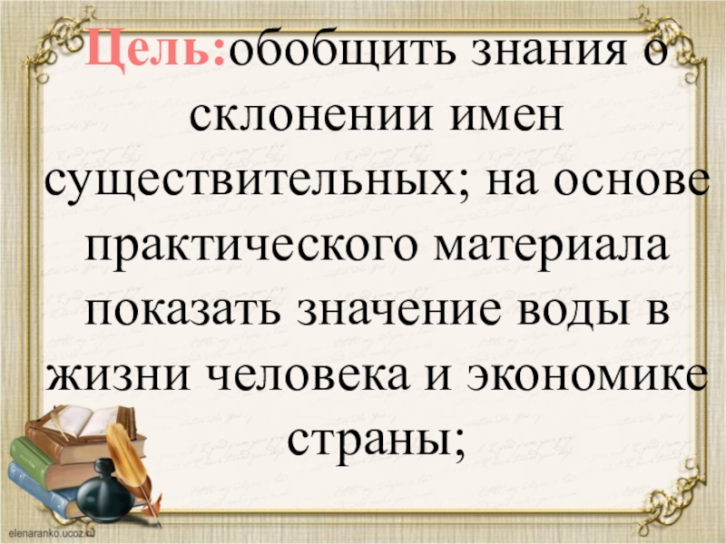 Цель:обобщить знания о склонении имен существительных; на основе практического материала показать значение воды в жизни человека и