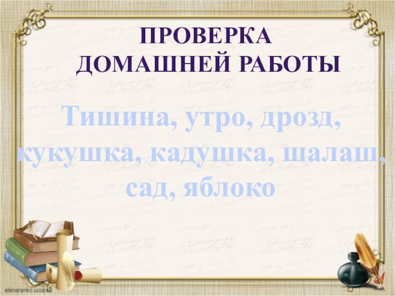 Проверка домашней работыТишина, утро, дрозд, кукушка, кадушка, шалаш, сад, яблоко