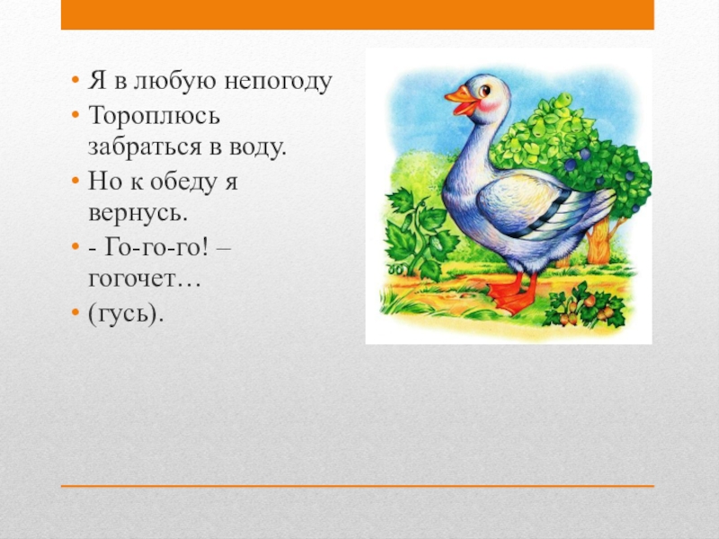 Я в любую непогодуТороплюсь забраться в воду.Но к обеду я вернусь.- Го-го-го! – гогочет…(гусь).