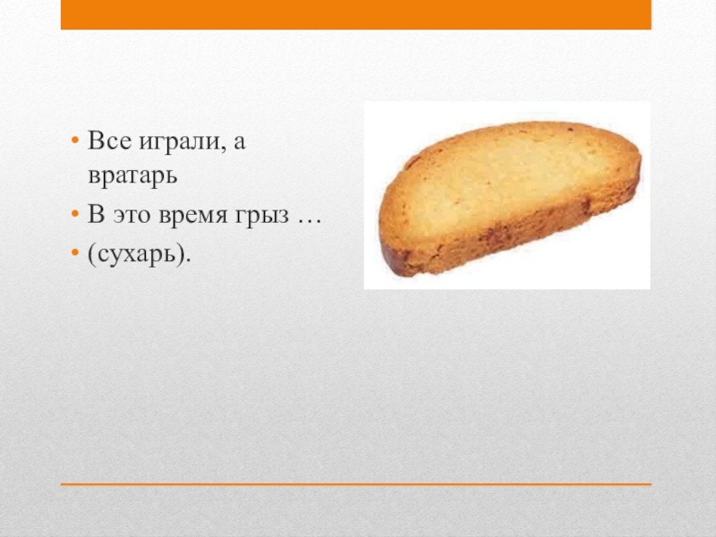 Все играли, а вратарьВ это время грыз …(сухарь).