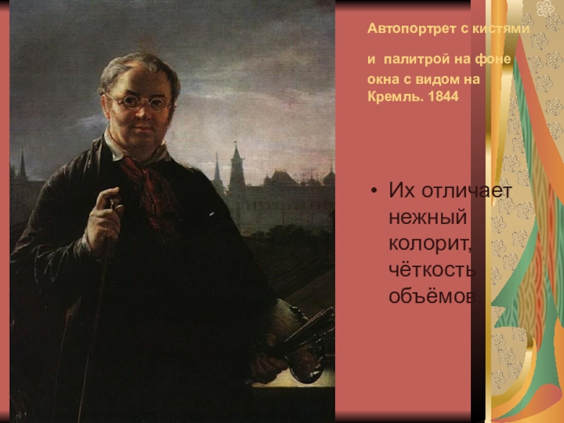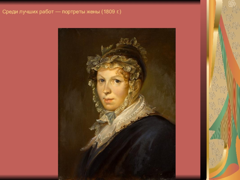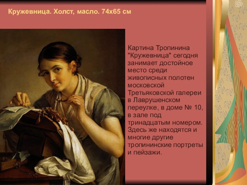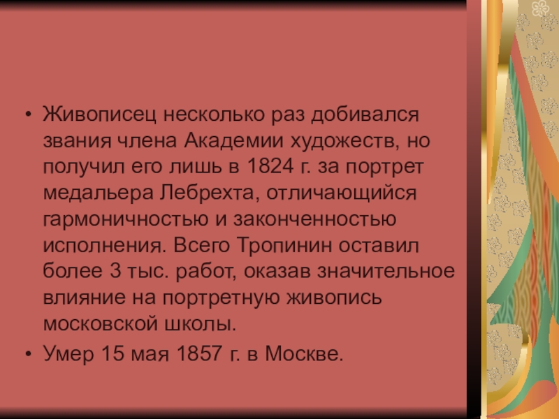 До 1821 г. жил на Украине. Получив свободу только в 47 лет (1823 г.), переехал в Москву, где трудился до конца жизни. Тропинин прекрасно усвоил наследие русских портретистов XVIII в., но при этом сумел выработать неповторимую живописную манеру. С большой теплотой и любовью он раскрывает внутренний мир изображаемых им людей.