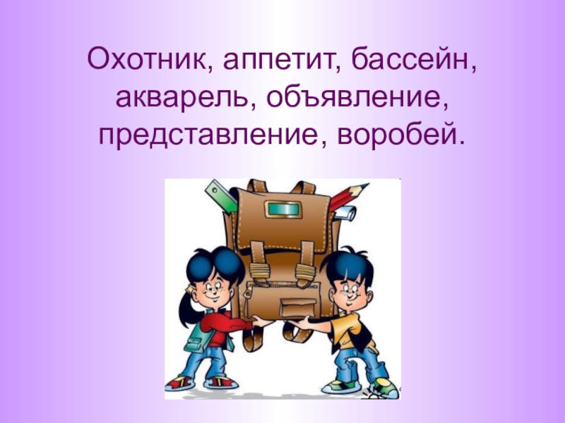 Слайд 2Охотник, аппетит, бассейн, акварель, объявление, представление, воробей.