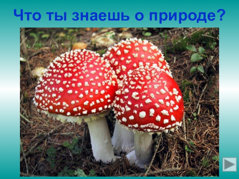 Ядовитый гриб с красной шляпкой в белых крапинкахЧто ты знаешь о природе?