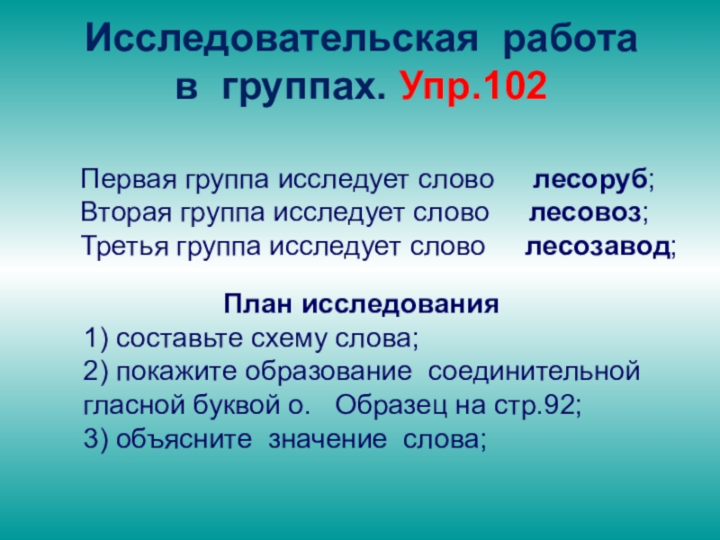 Исследовательская работа в группах. Упр.102Первая группа исследует слово   лесоруб;Вторая группа исследует слово   лесовоз;Третья