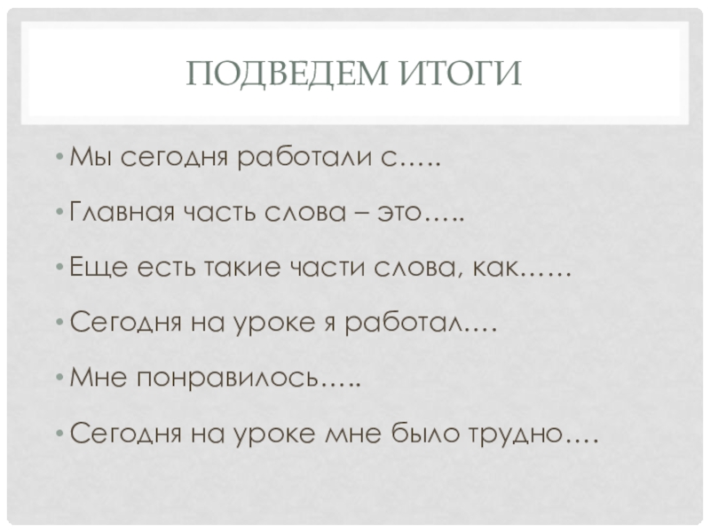 Подведем итогиМы сегодня работали с…..Главная часть слова – это…..Еще есть такие части слова, как……Сегодня на уроке я