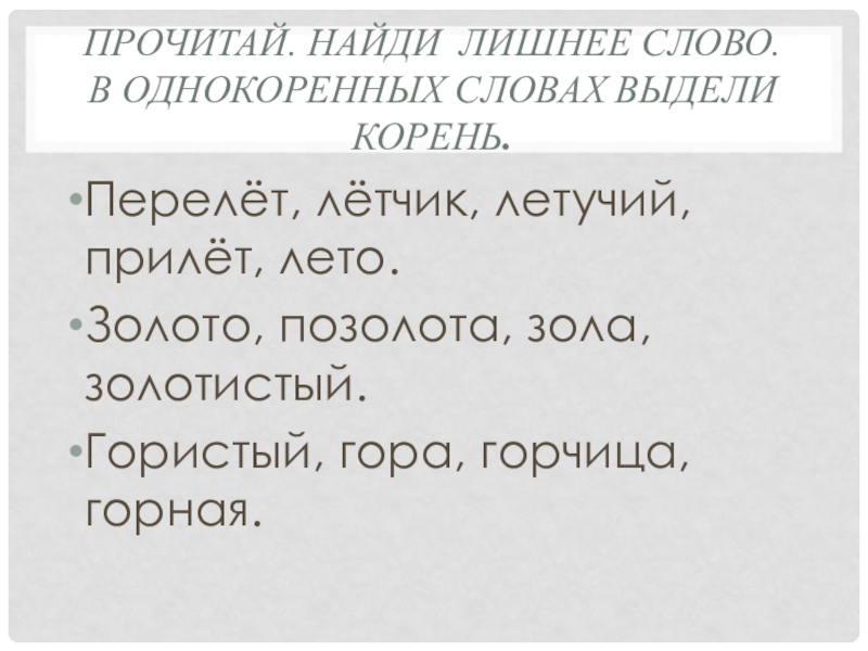 Слайд 8Прочитай. Найди лишнее слово. В однокоренных словах выдели корень.