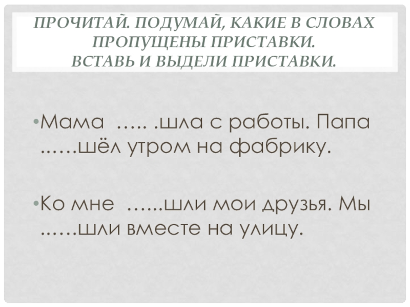 Прочитай. Подумай, какие в словах пропущены приставки.  Вставь и выдели приставки.Мама ….. .шла с работы. Папа