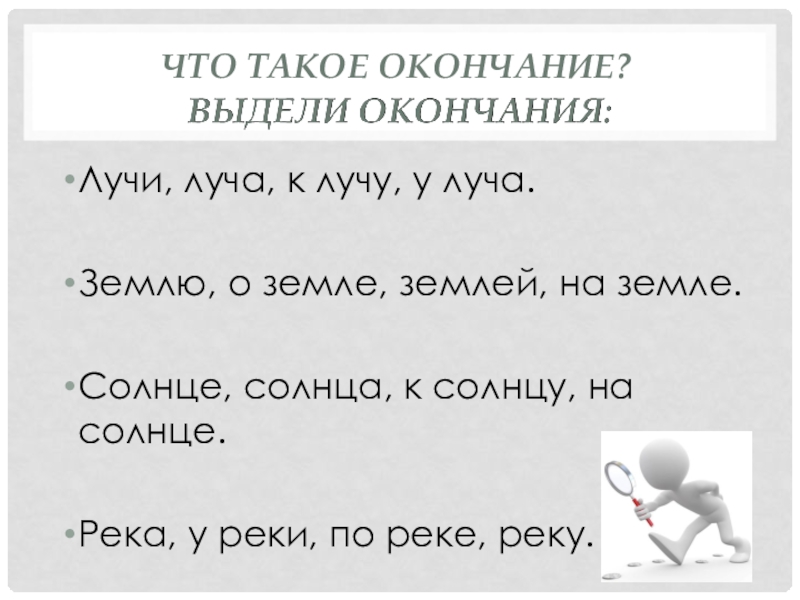 Что такое окончание?  Лучи, луча, к лучу, у луча.Землю, о земле, землей, на земле.Солнце, солнца, к