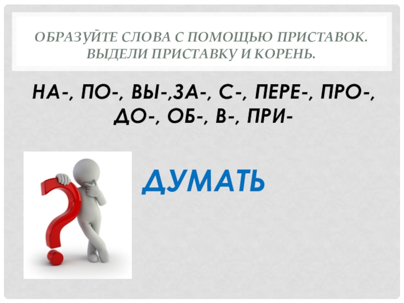 Слайд 6Образуйте слова с помощью приставок. Выдели приставку и корень.