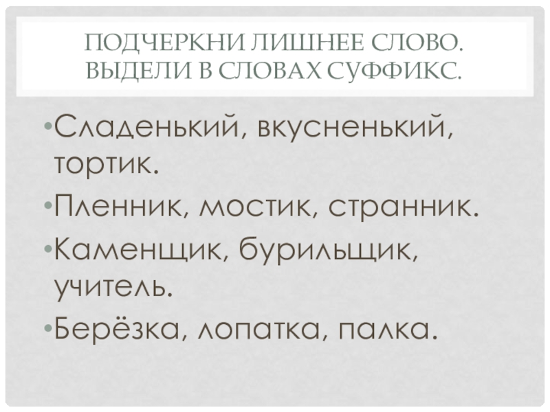 Подчеркни лишнее слово. Выдели в словах суффикс.Сладенький, вкусненький, тортик.Пленник, мостик, странник.Каменщик, бурильщик, учитель.Берёзка, лопатка, палка.
