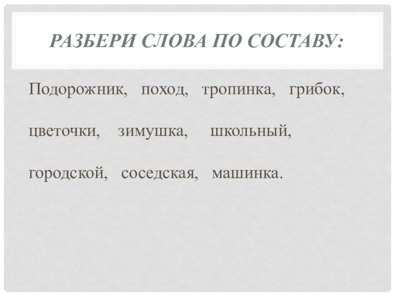 Разбери слова по составу:Подорожник,  поход,  тропинка,  грибок, цветочки,  зимушка,   школьный, городской,