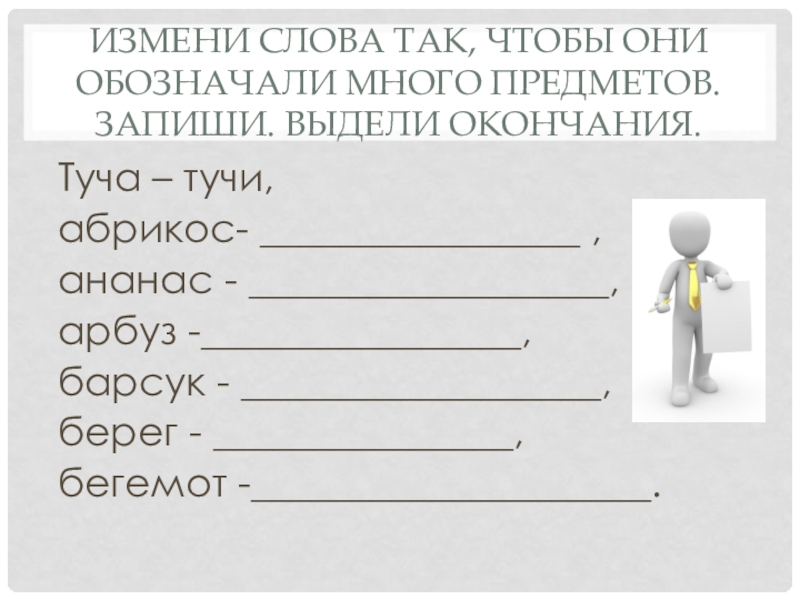 Измени слова так, чтобы они обозначали много предметов. Запиши. Выдели окончания.Туча – тучи, абрикос- ________________ , ананас
