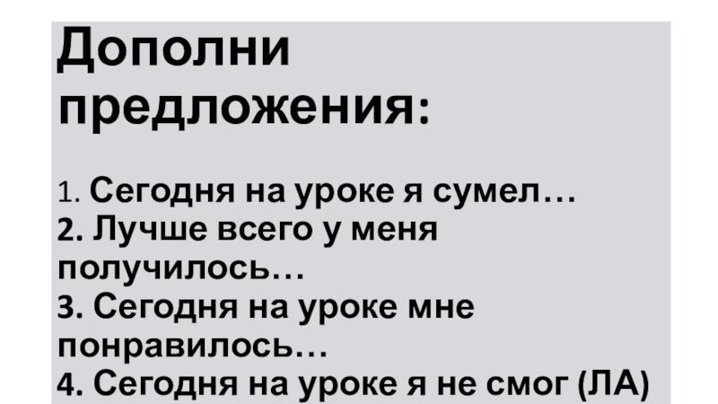 Дополни предложения:  1. Сегодня на уроке я сумел… 2. Лучше всего у меня получилось… 3. Сегодня