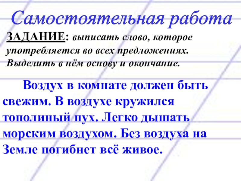 Воздух в комнате должен быть свежим. В воздухе кружился тополиный пух. Легко дышать морским воздухом. Без воздуха на Земле погибнет всё живое.