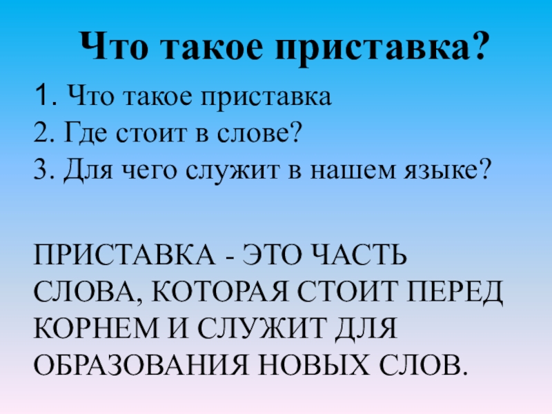 ПРИСТАВКА - ЭТО ЧАСТЬ СЛОВА, КОТОРАЯ СТОИТ ПЕРЕД КОРНЕМ И СЛУЖИТ ДЛЯ ОБРАЗОВАНИЯ НОВЫХ СЛОВ.