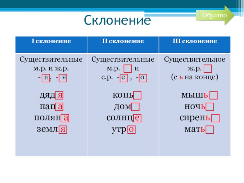 РодМужской род(он, мой)Женский род(она, моя)Средний род(оно, моё)МальчикДевочкаМолокоОбратно