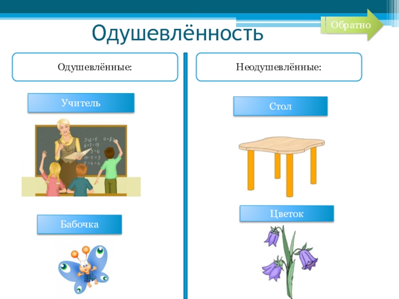 ОдушевлённостьОдушевлённые:Неодушевлённые:УчительБабочкаЦветокСтолОбратно