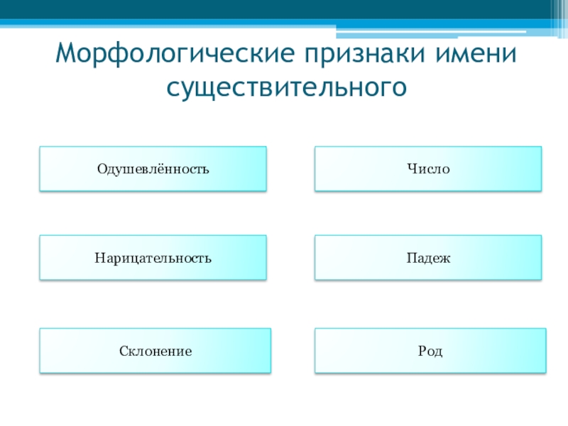 Морфологические признаки имени существительного ОдушевлённостьНарицательностьСклонениеРодЧислоПадеж