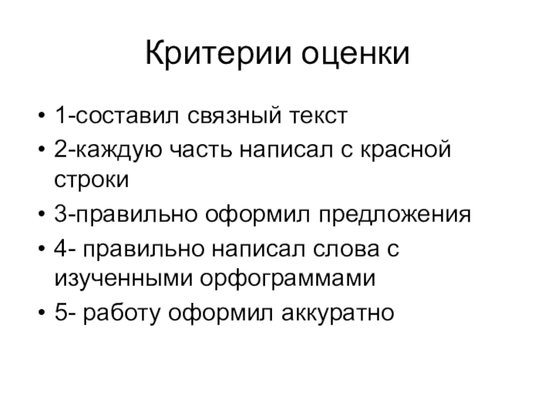 Критерии оценки1-составил связный текст2-каждую часть написал с красной строки3-правильно оформил предложения4- правильно написал слова с изученными орфограммами5-