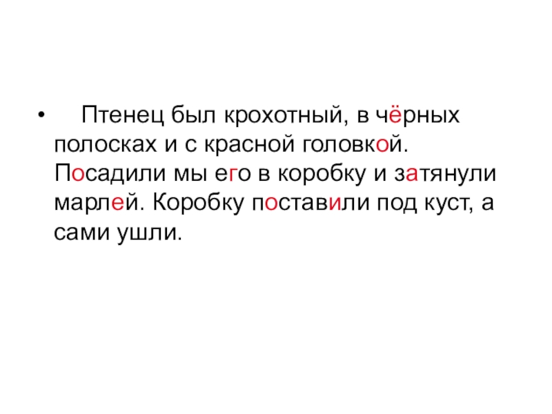 Птенец был крохотный, в чёрных полосках и с красной головкой. Посадили мы его в коробку