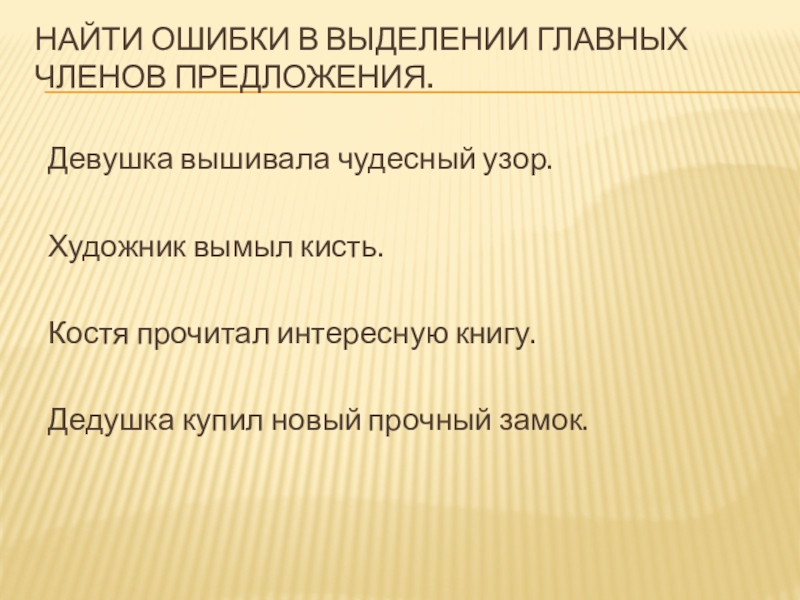 Слайд 5Найти ошибки в выделении главных членов предложения.