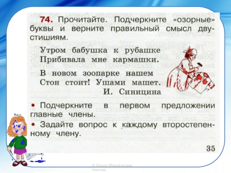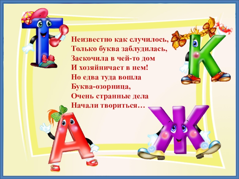 Неизвестно как случилось,Только буква заблудилась,Заскочила в чей-то домИ хозяйничает в нем!Но едва туда вошлаБуква-озорница,Очень странные делаНачали твориться…