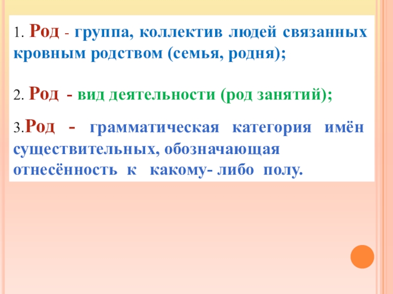 1. Род - группа, коллектив людей связанных кровным родством (семья, родня);2. Род - вид деятельности (род занятий);3.Род