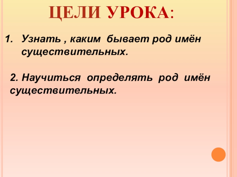 ЦЕЛИ УРОКА: Узнать , каким бывает род имён существительных.2. Научиться определять род имён существительных.