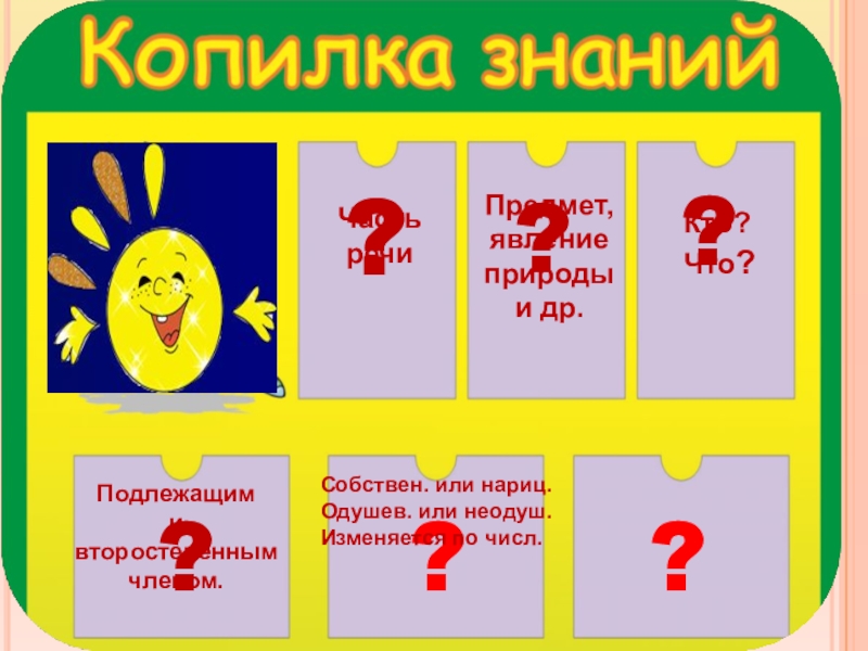 ??????Часть речиПредмет,явление природыи др. Кто? Что?Подлежащими второстепенным членом.Собствен. или нариц.Одушев. или неодуш.Изменяется по числ.