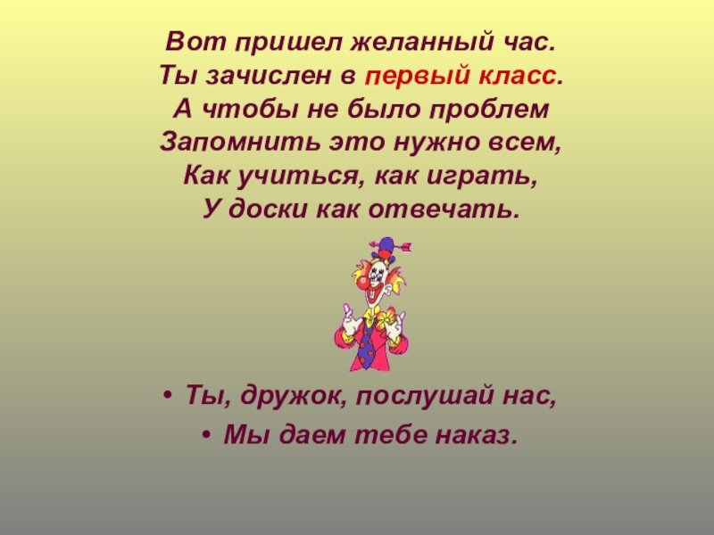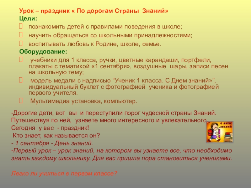 -Первый урок – урок знаний, на котором вы узнаете все, что необходимо знать каждому школьнику. Для вас пришла пора становиться учениками.