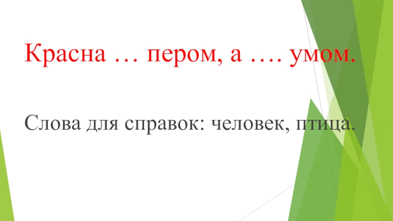 Красна … пером, а …. умом.Слова для справок: человек, птица.