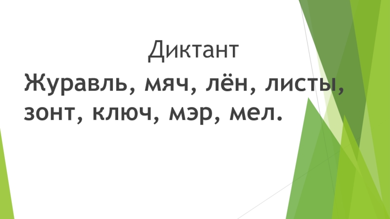 ДиктантЖуравль, мяч, лён, листы, зонт, ключ, мэр, мел.