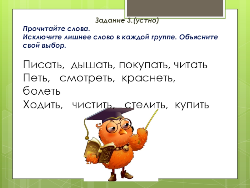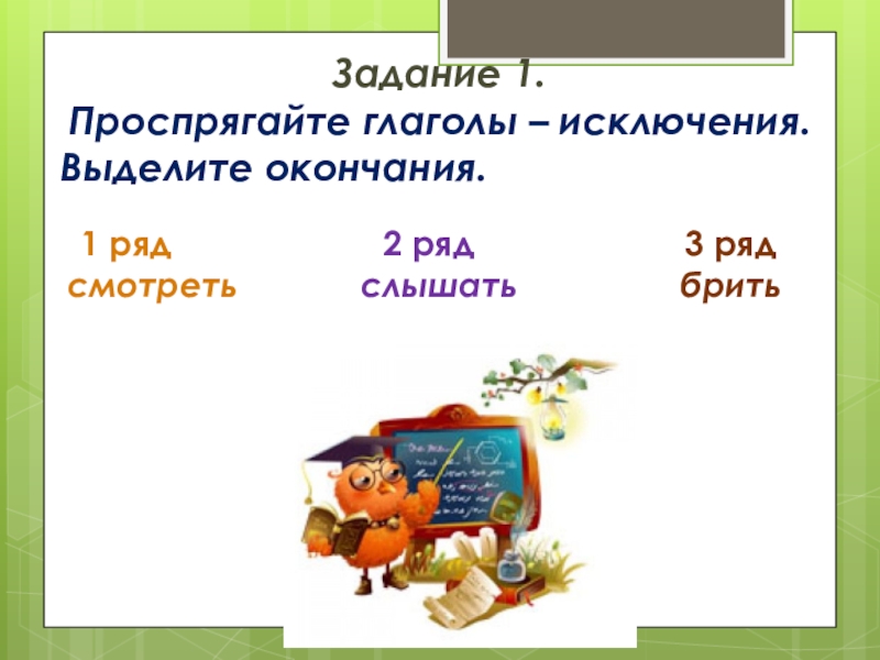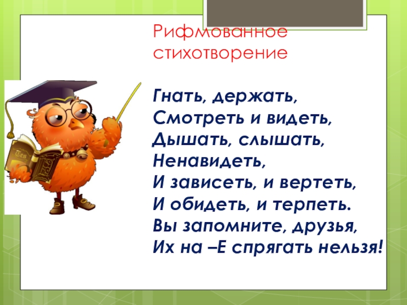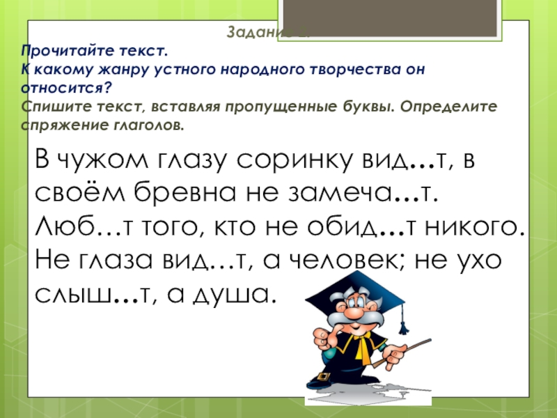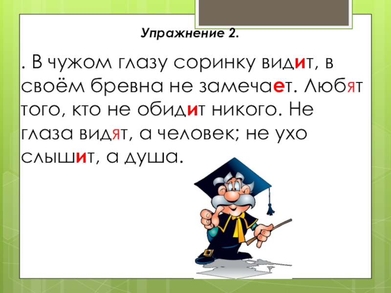 В чужом глазу соринку вид…т, в своём бревна не замеча…т. Люб…т того, кто не обид…т никого. Не глаза вид…т, а человек; не ухо слыш…т, а душа.