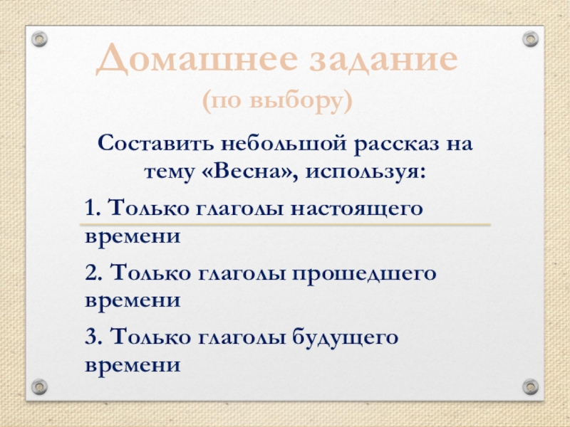 Домашнее задание(по выбору)Составить небольшой рассказ на тему «Весна», используя:1. Только глаголы настоящего времени2. Только глаголы прошедшего времени3.