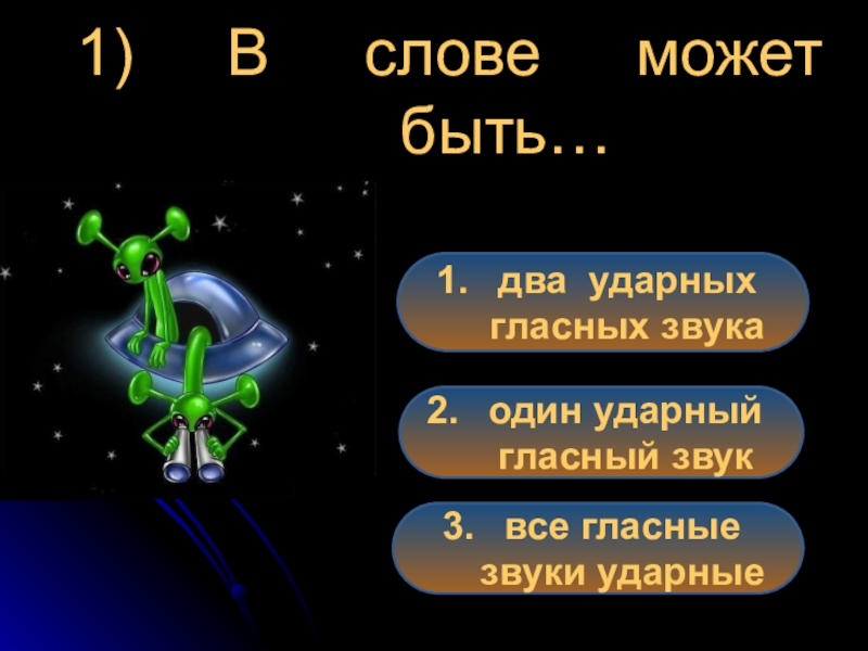 один ударный гласный звукдва ударных гласных звукавсе гласные звуки ударные1) В слове может