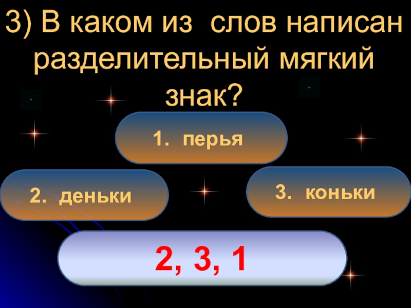 3) В каком из слов написан разделительный мягкий знак?перьяконькиденьки2, 3, 1