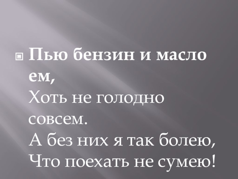 Слайд 2Пью бензин и масло ем, Хоть не голодно совсем. А без них я