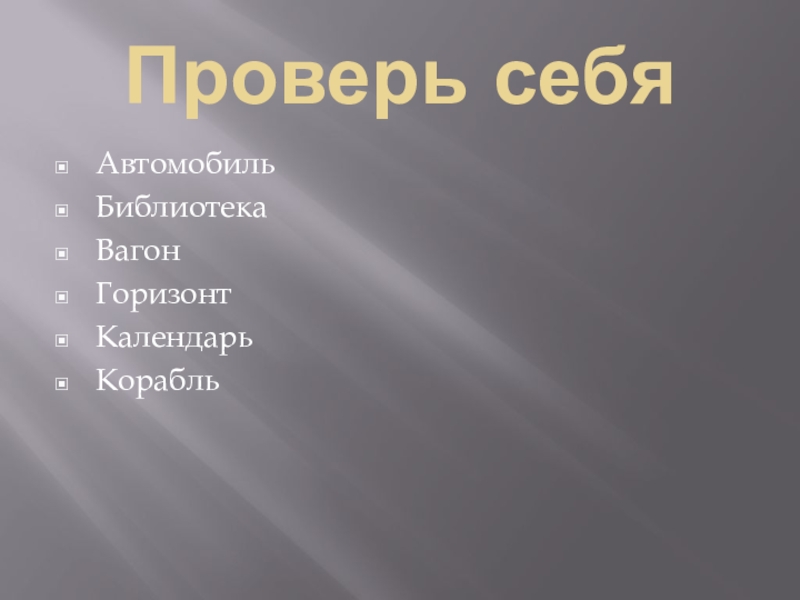 Проверь себяАвтомобильБиблиотекаВагонГоризонтКалендарь Корабль