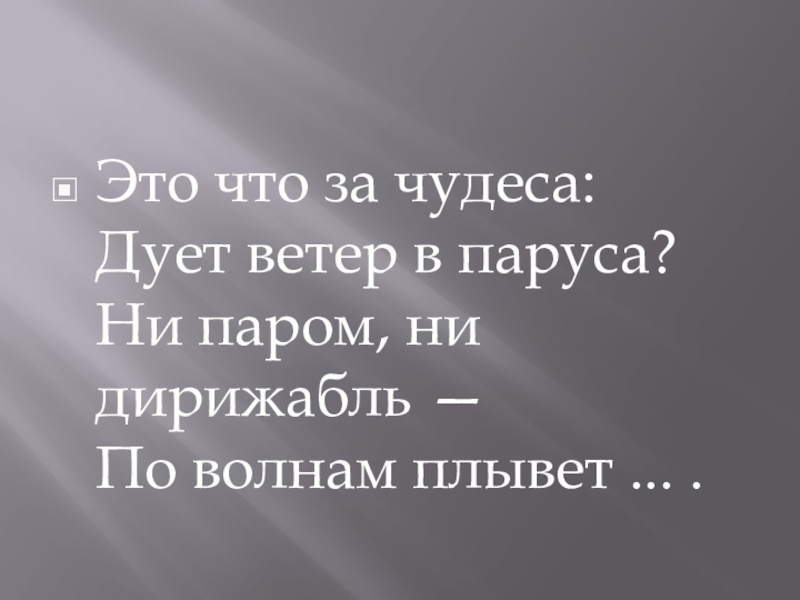 Слайд 12Это что за чудеса: Дует ветер в паруса? Ни паром, ни дирижабль — По
