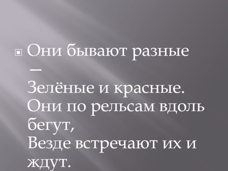 Слайд 6Они бывают разные —  Зелёные и красные.  Они по рельсам вдоль бегут,  Везде встречают