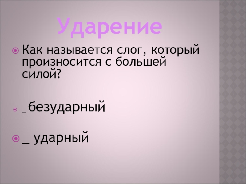 Ударение Как называется слог, который произносится с большей силой?_ безударный_ ударный