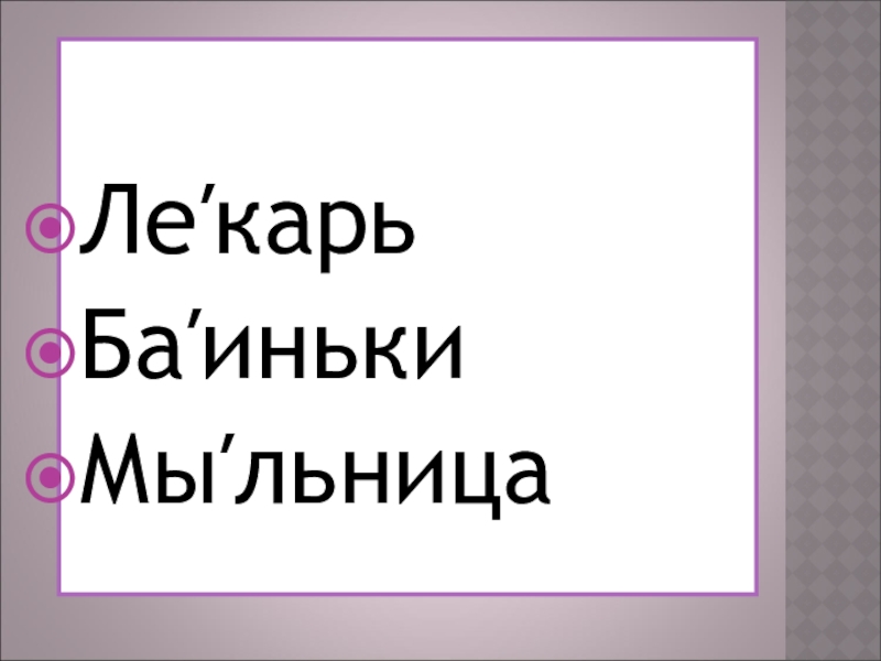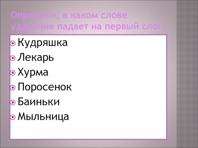 Определи, в каком слове ударение падает на первый слог:КудряшкаЛекарьХурмаПоросенокБаинькиМыльница