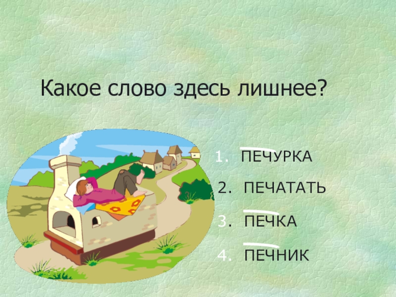 Какое слово здесь лишнее?1. ПЕЧУРКА2. ПЕЧАТАТЬ3. ПЕЧКА4. ПЕЧНИК