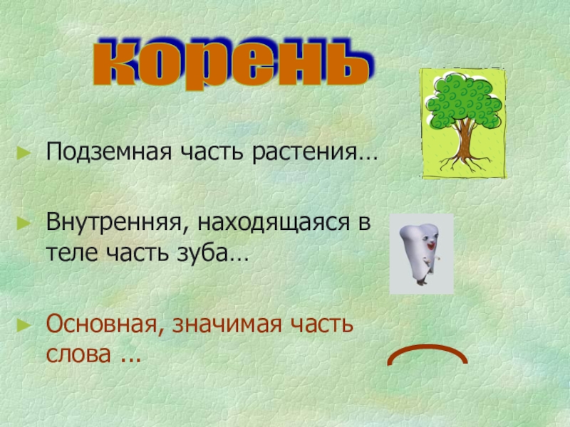 корень Подземная часть растения…Внутренняя, находящаяся в теле часть зуба…Основная, значимая часть слова ...