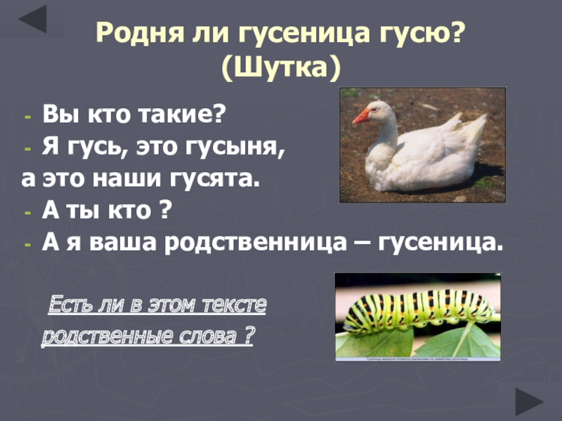 Слайд 9Родня ли гусеница гусю? (Шутка)