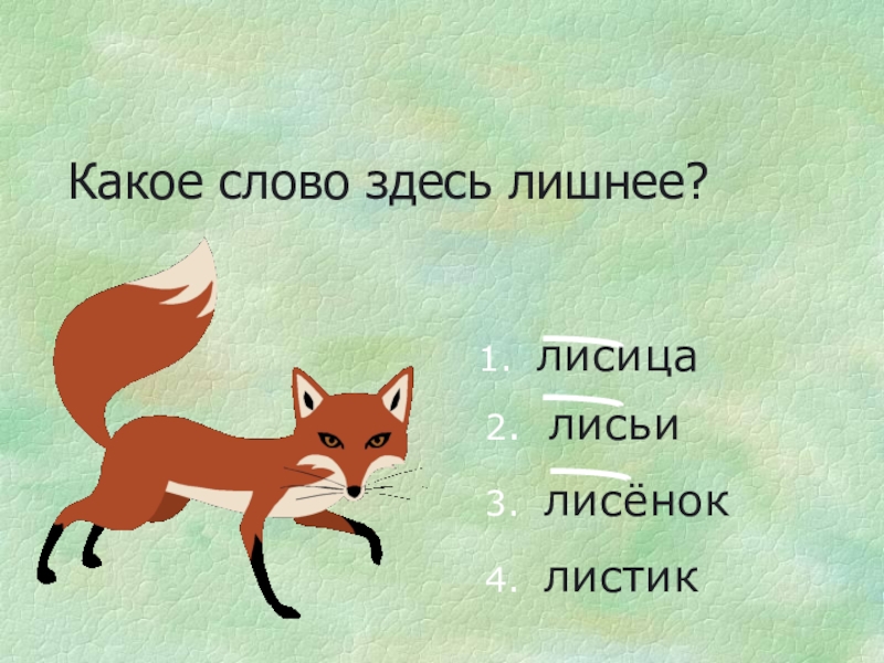 Какое слово здесь лишнее?1. лисица2. лисьи3. лисёнок4. листик