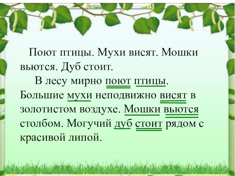 Слайд 6 Поют птицы. Мухи висят. Мошки вьются. Дуб стоит.