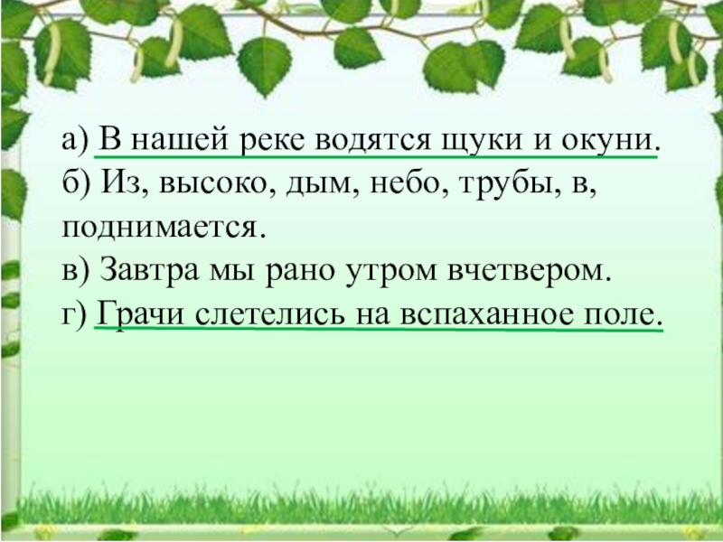 а) В нашей реке водятся щуки и окуни.б) Из, высоко, дым, небо, трубы, в, поднимается.в) Завтра мы рано утром вчетвером.г) Грачи слетелись на вспаханное поле.