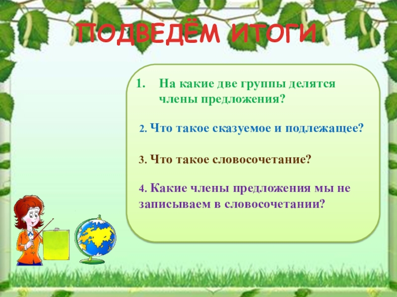 ПОДВЕДЁМ ИТОГИНа какие две группы делятся члены предложения?2. Что такое сказуемое и подлежащее?3. Что такое словосочетание?4. Какие
